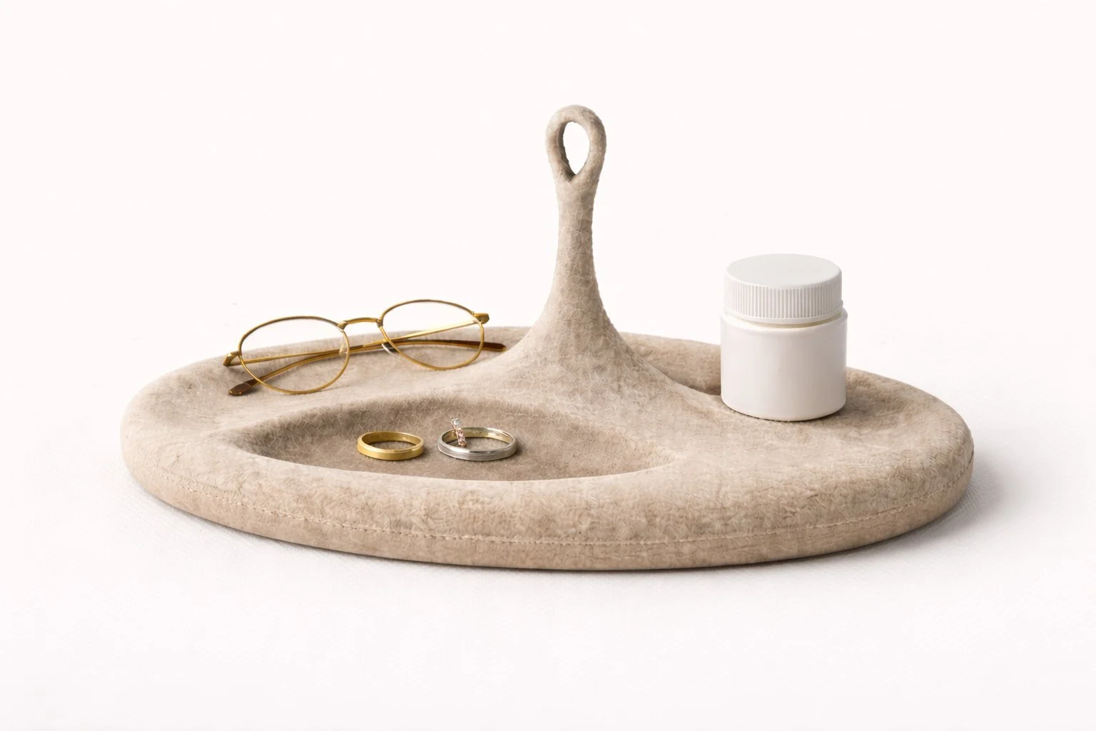 Nap is a bedside catchall for the small objects shed before sleep-rings, glasses, a pill bottle the residue of the day. Formed from felt, its soft surface is as much about touch as it is about sight. Eyes closed, you know exactly where things are. A raised central loop anchors jewelry; the broad curved well holds whatever the night requires. (Note: material and form may vary slightly from the rendering.) Digital visualization generated using AI as part of the design process